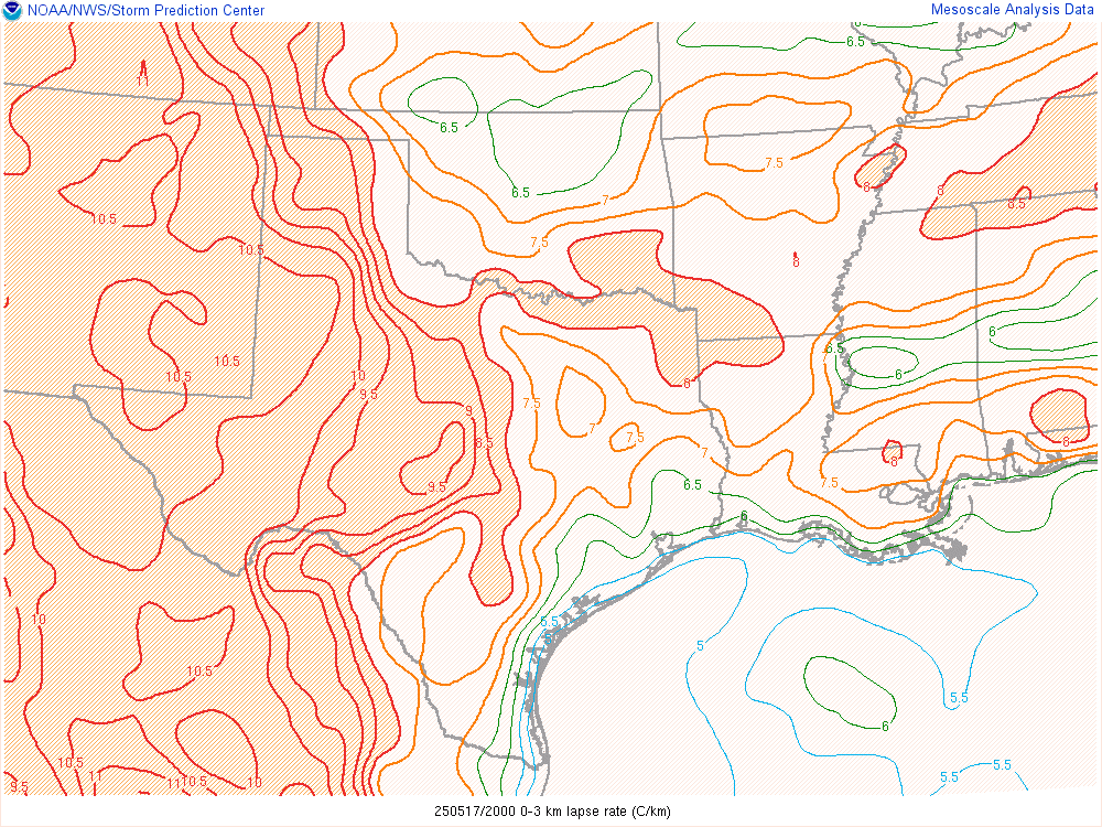 Shreveport morning sounding showed a very moist atmosphere with a PWAT value of over 2″. Norman was north of the boundary, which was very dry. A steady stream of westerlies in the upper levels would ensure decent venting.