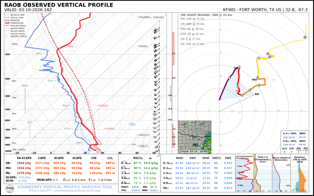 Fort Worth sounding at 18z still showed a very moist and conditionally unstable conditions. The capping was still in place suppressing convection as the cutoff low rolled into the vicinity.
